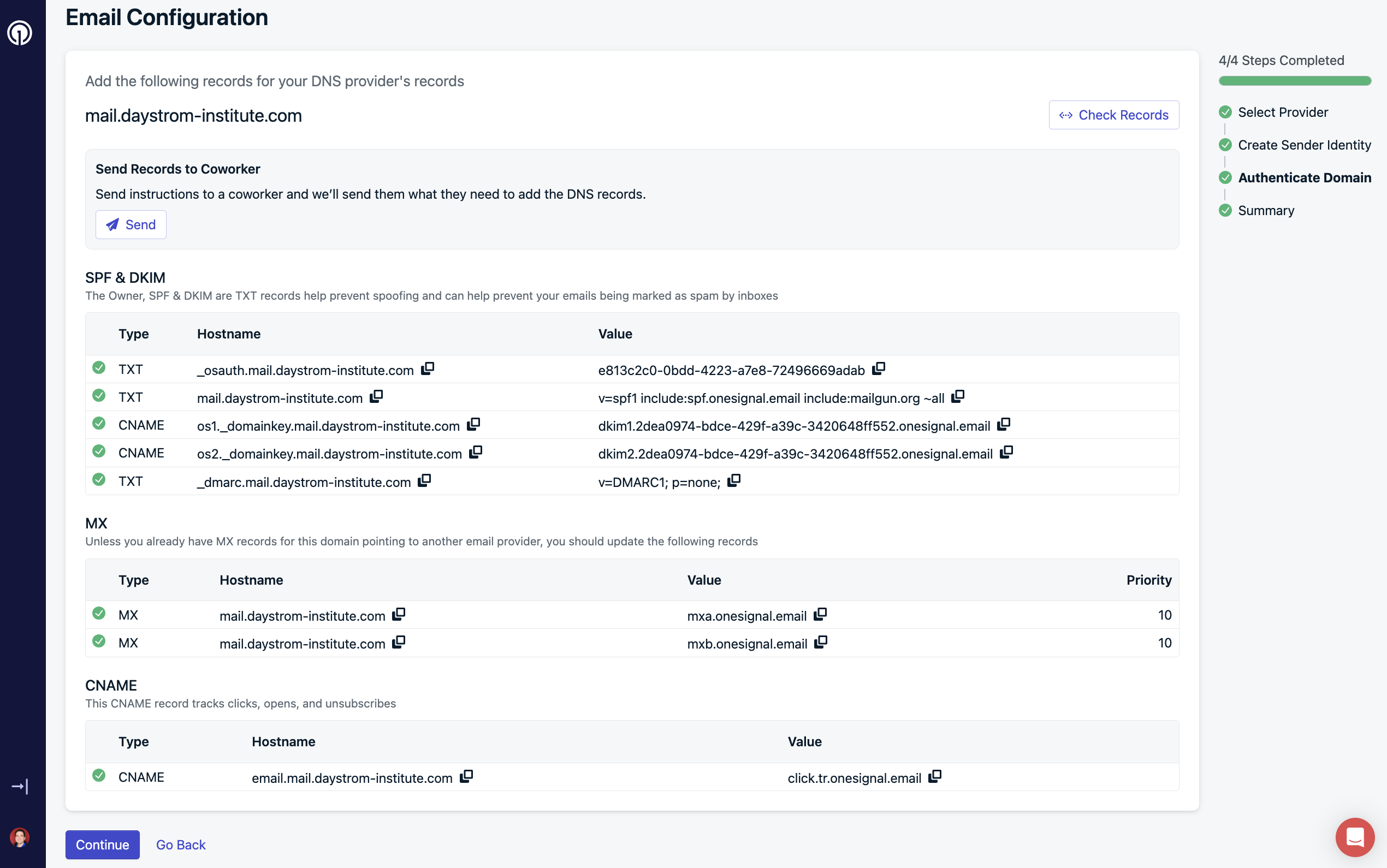 完成邮件设置步骤,直到提示您添加 DNS 记录,然后返回这里。 从 OneSignal 仪表板复制每个 DNS 记录: