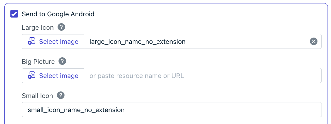 在 OneSignal 仪表板中,使用消息 > 推送 > 新推送表单或模板,导航到特定于平台的选项。 对于 Android、Amazon 和华为,如果文件存在于与默认图标相同的项目路径中,请设置图标名称时不包含文件扩展名。对于大通知图标,您还可以提供将显示图标的直接 URL。