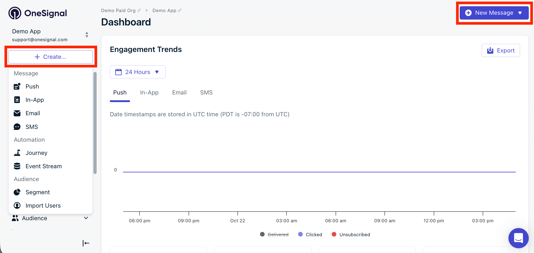 Send new message options in the OneSignal dashboard.