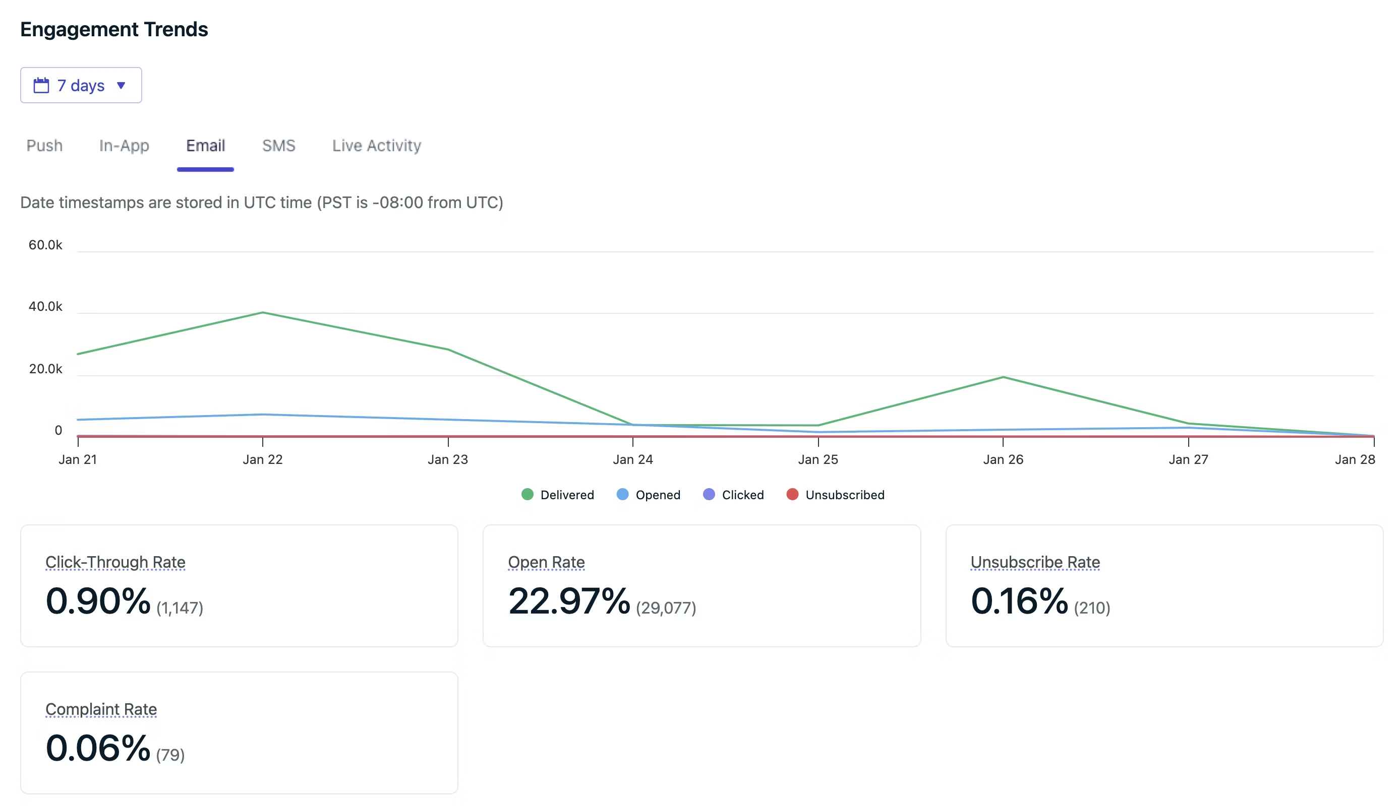 | Track trends over time (opens, clicks, sends) | Engagement trends |