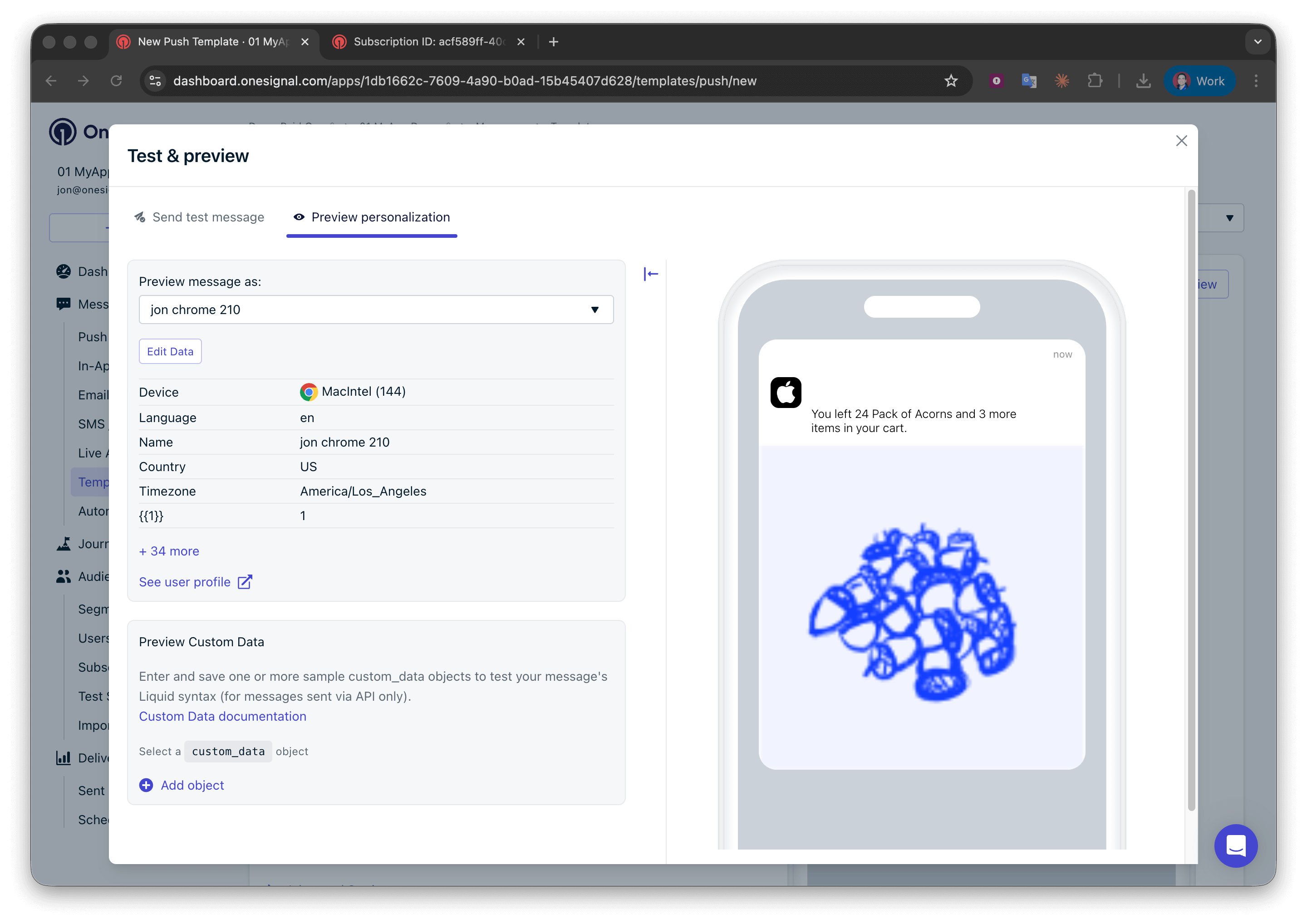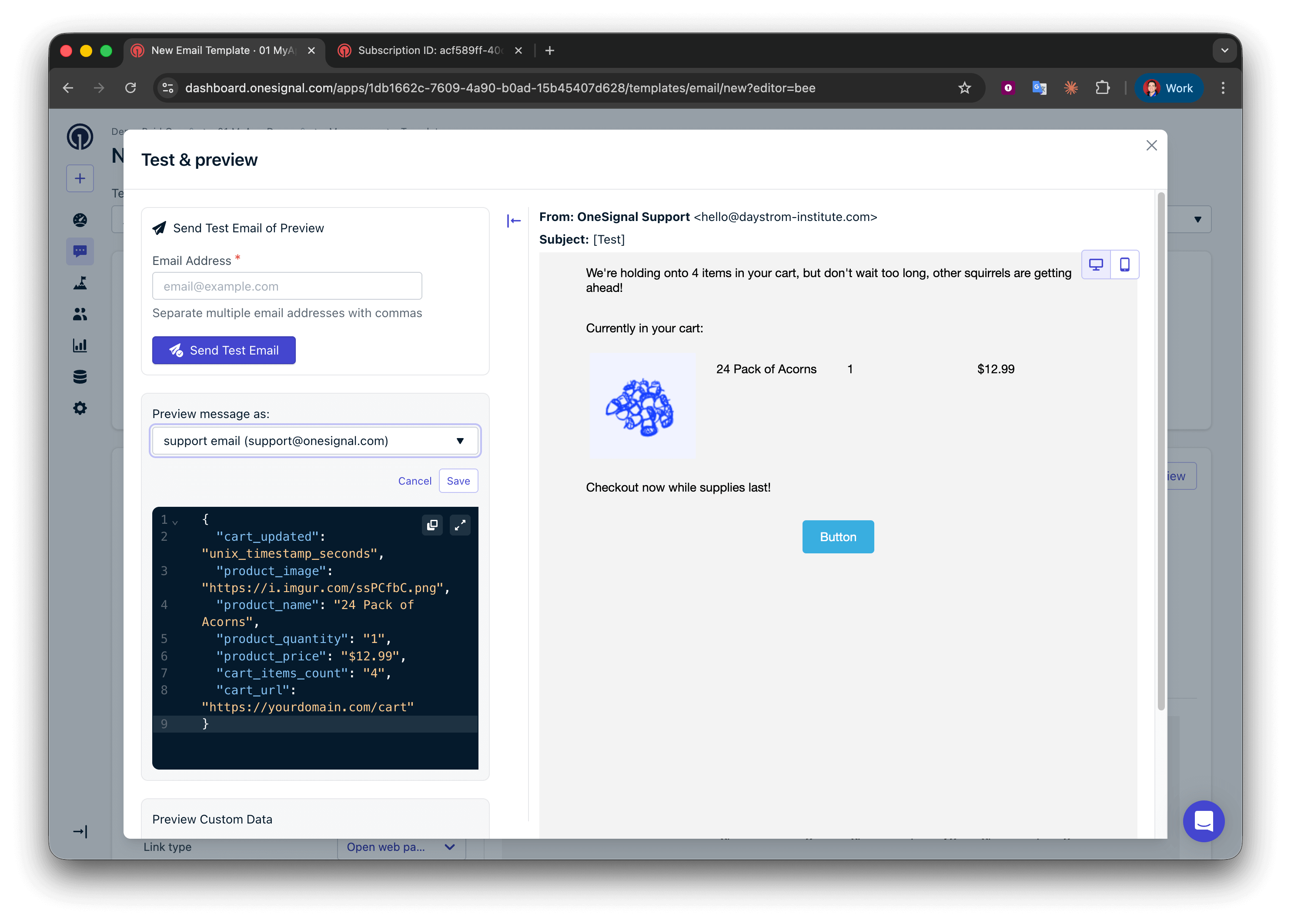This example shows how to personalize abandoned cart messages using user tags. It builds on the Abandoned Cart tutorial. Example tags set:JSON