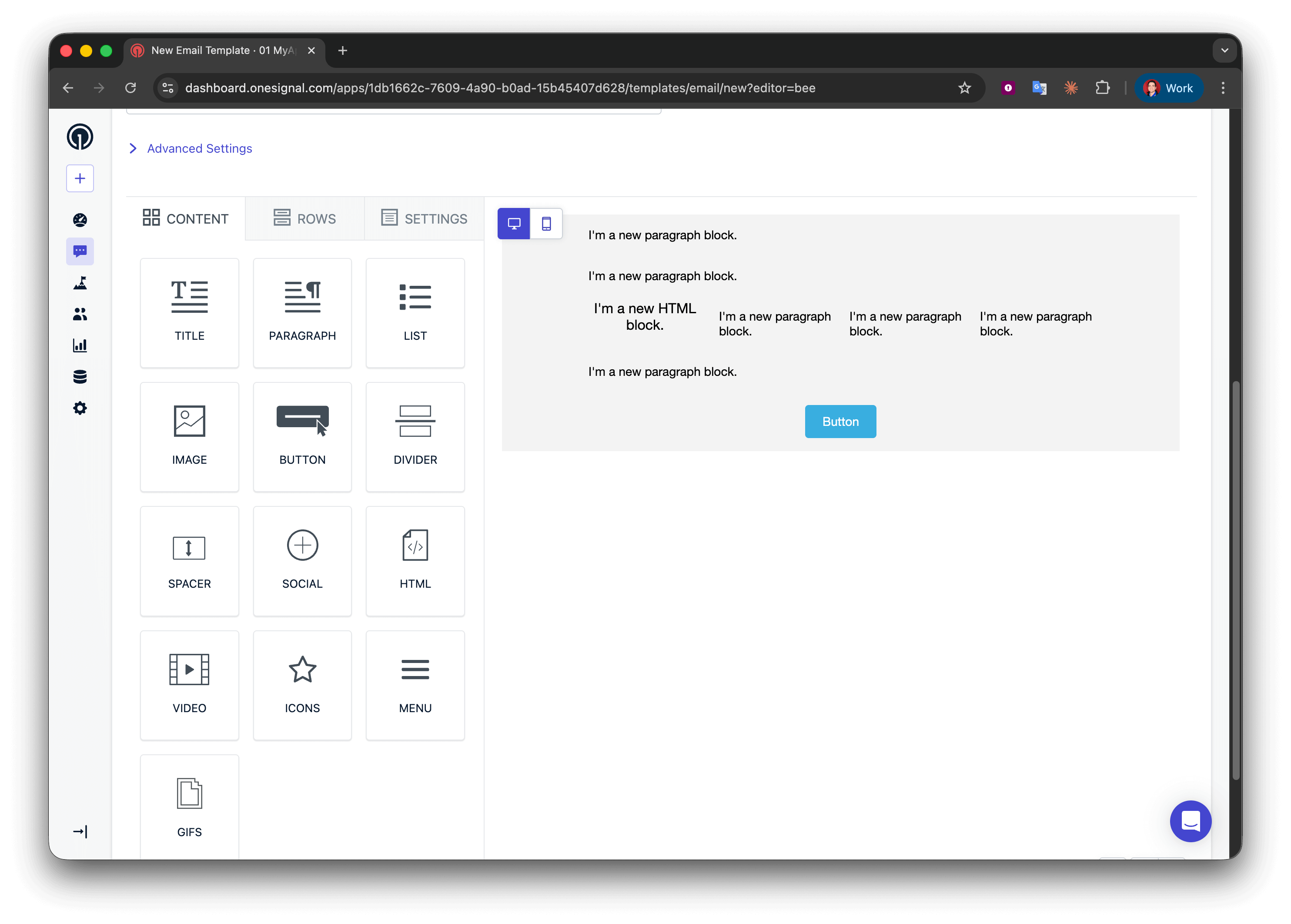 Success! Now you can apply your own styling to the template. See Design emails with drag-and-drop.