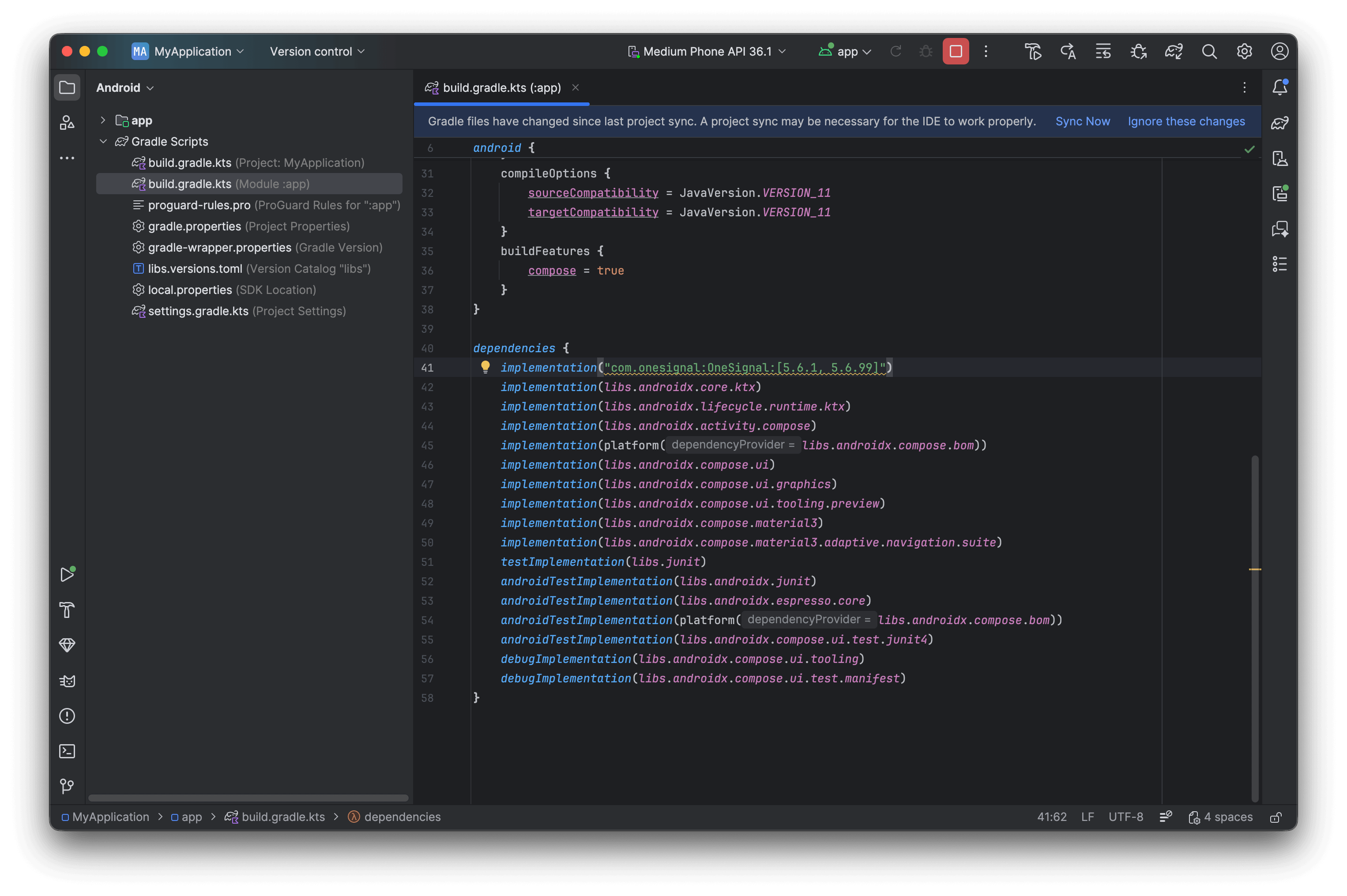 build.gradle.kts (Module: app)oubuild.gradle (Module: app) - Ajoutez OneSignal à votre section