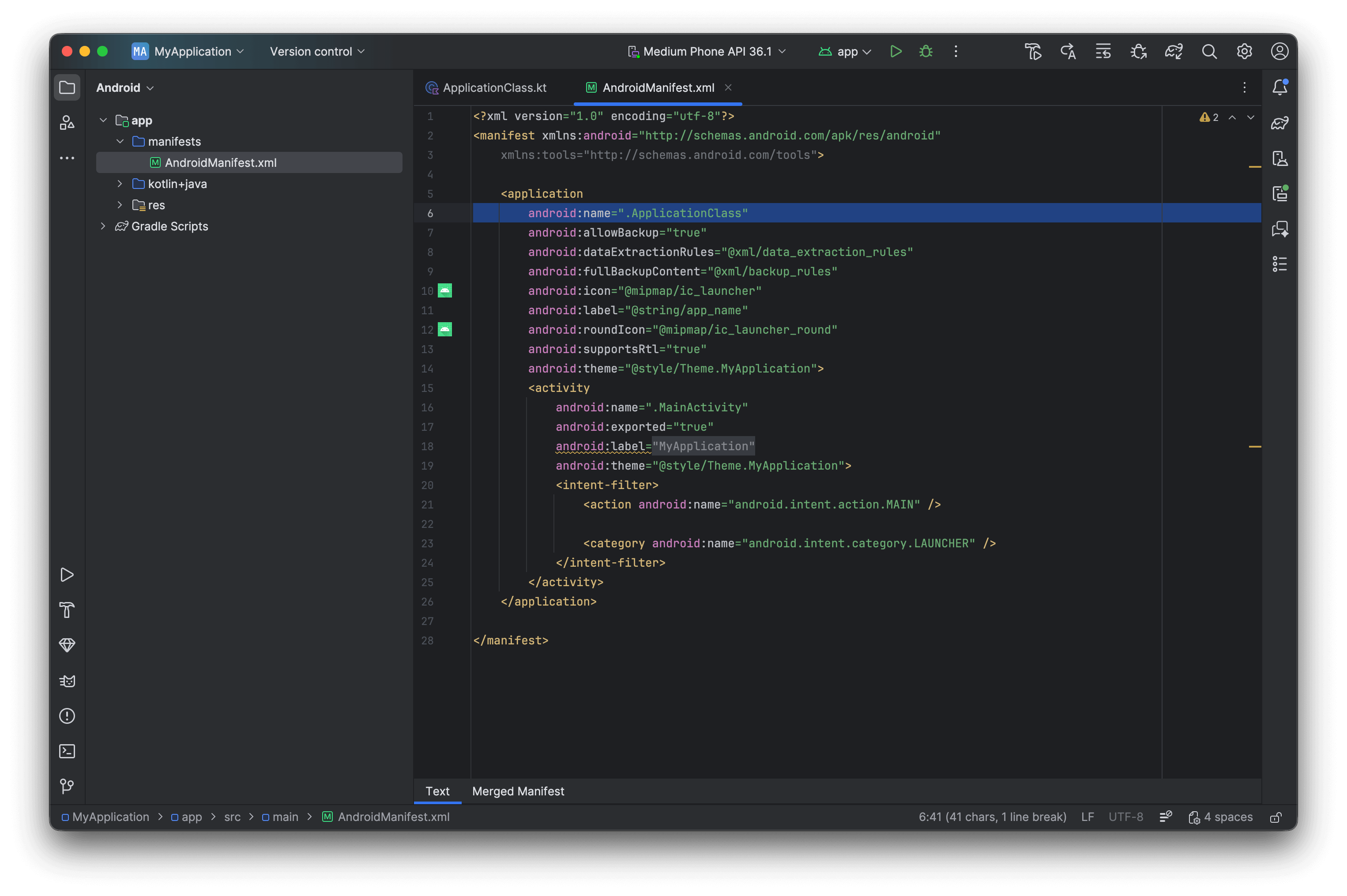 <application>, ajoutezandroid:name=".ApplicationClass"(remplacez.ApplicationClasspar le nom réel de votre classe si vous l’avez défini différemment).