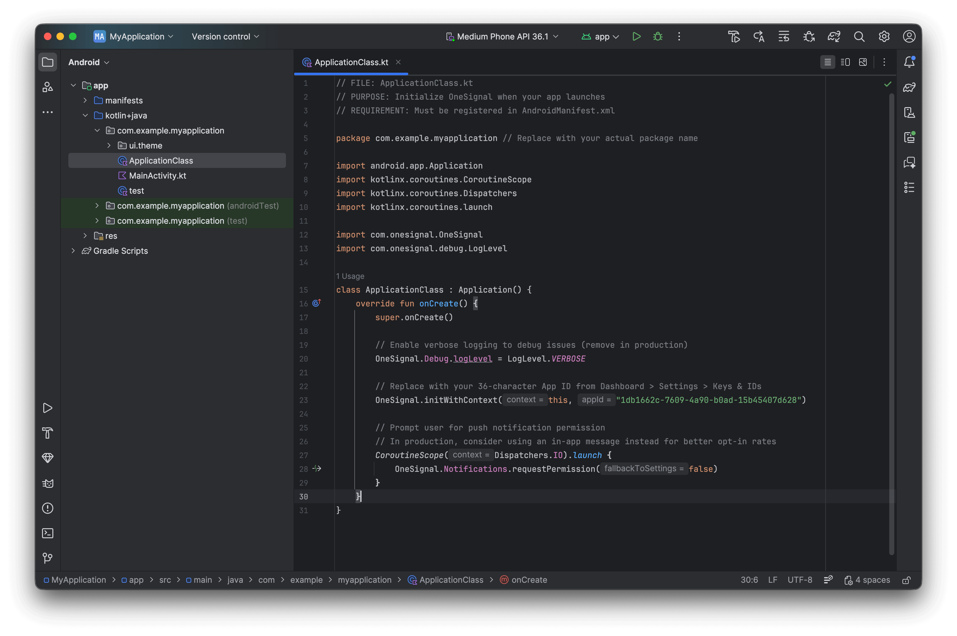 La bonne pratique est d’initialiser OneSignal dans la méthodeonCreate de votre classe Application pour garantir une configuration correcte du SDK sur tous les points d’entrée.