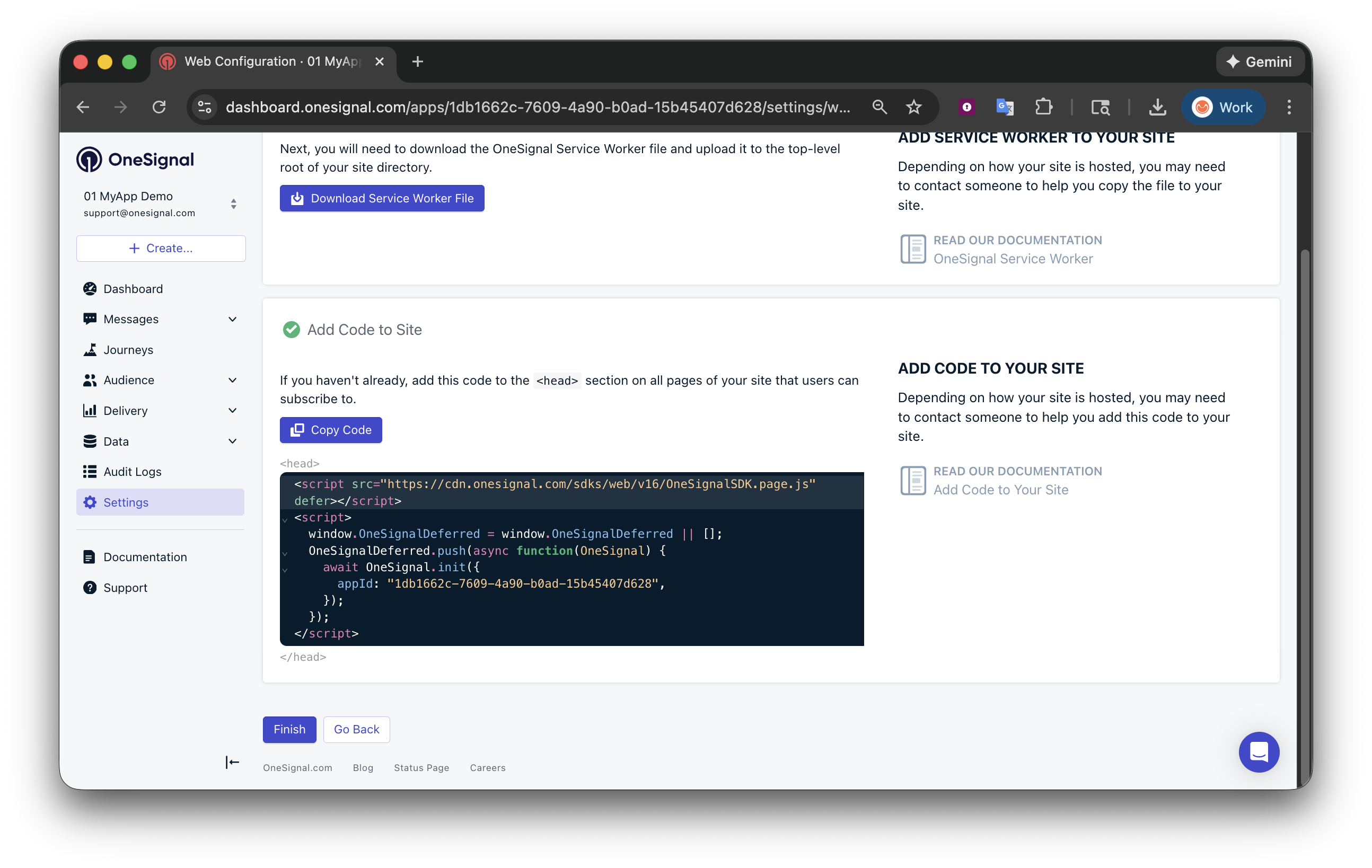 - Complétez le flux de configuration du SDK Web OneSignal jusqu’à atteindre l’étape Ajouter le code au site. Si vous faites cela, vous aurez :