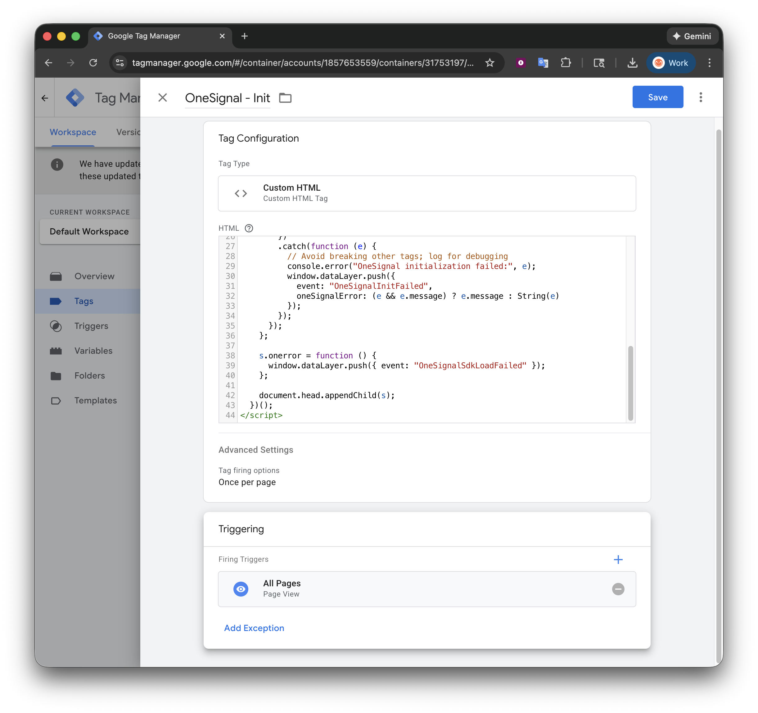 OneSignal - Init - Tag Type : Custom HTML