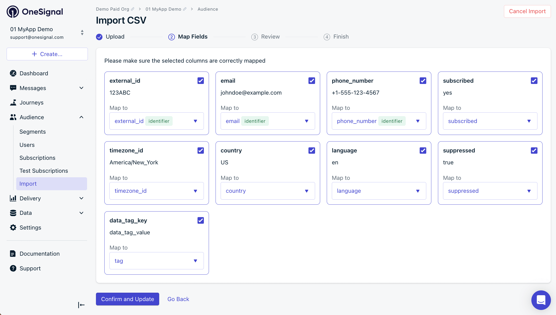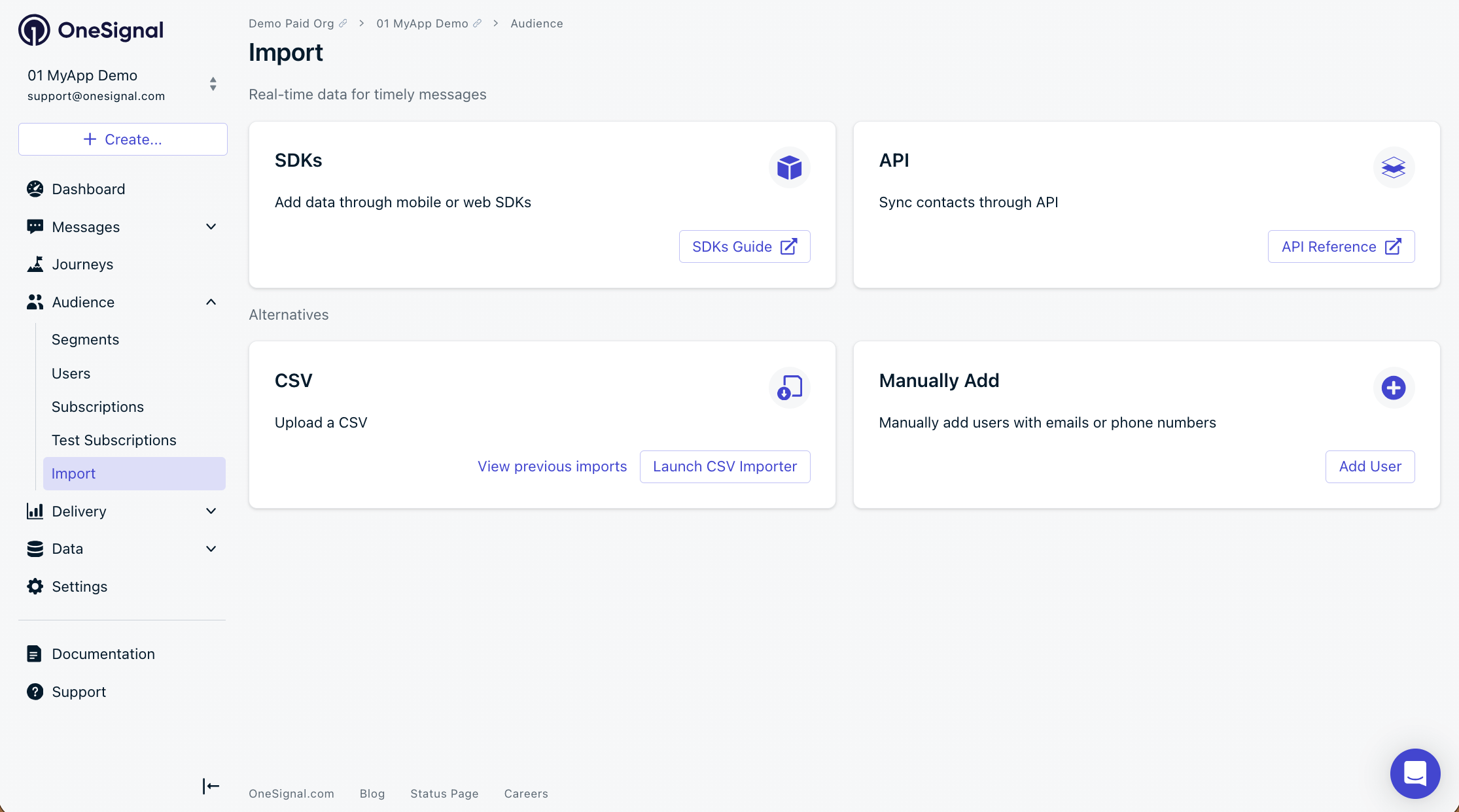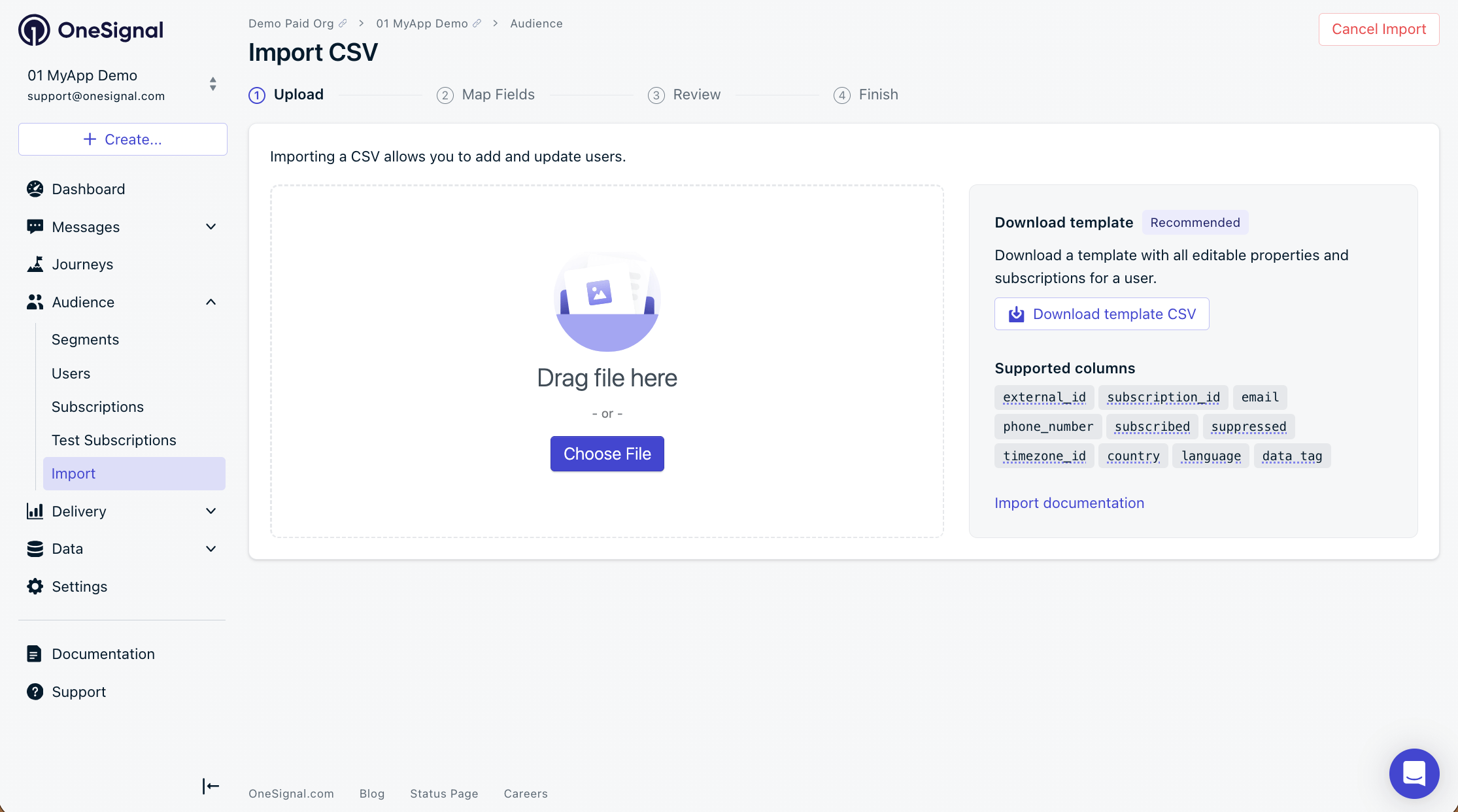 Use a CSV file to import email addresses, phone numbers, external IDs, Tags, language, timezone, country, and more! Access the CSV importer in your OneSignal dashboard by navigating to Audience > Import and clicking Launch CSV Importer.