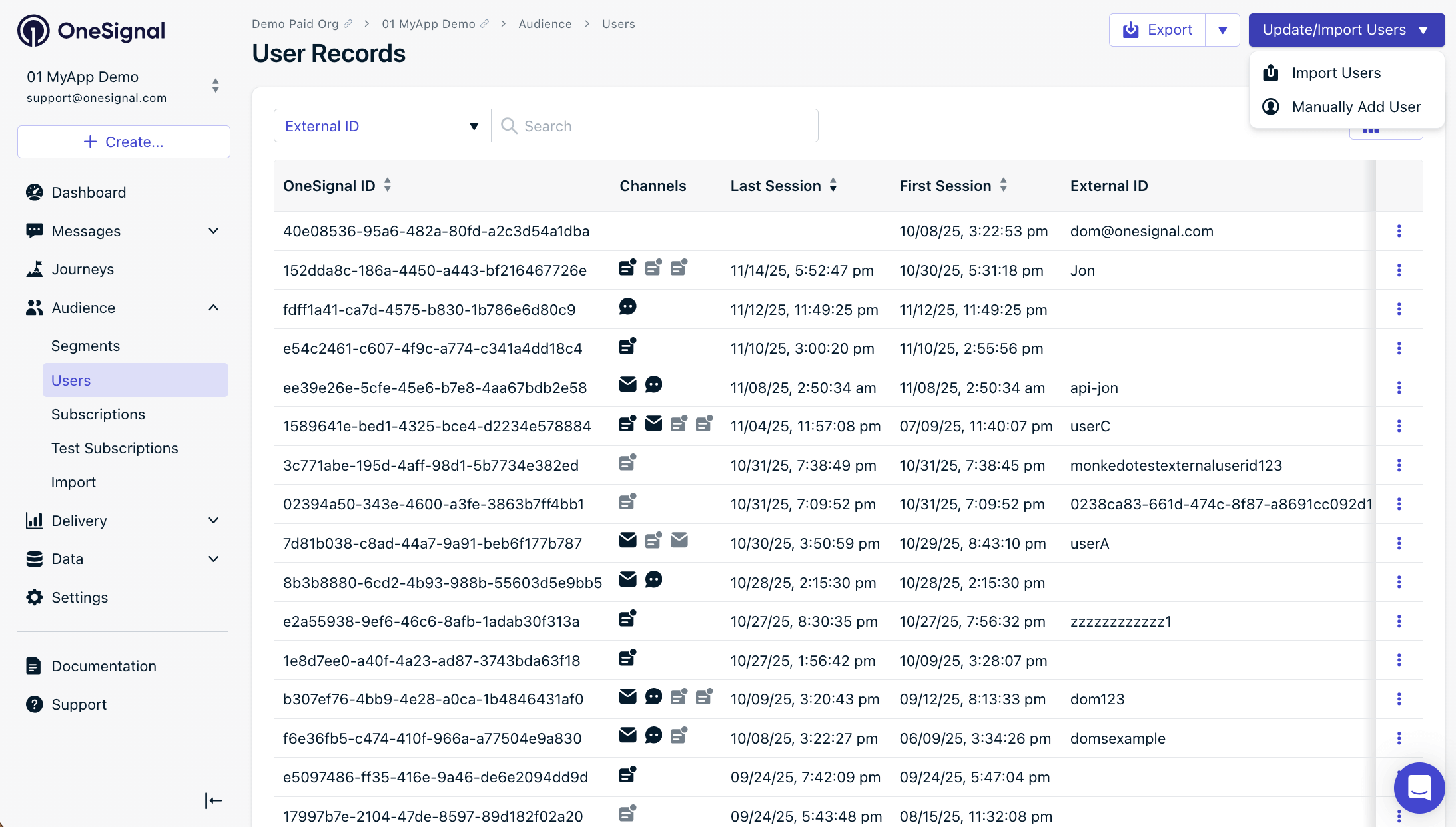 This guide covers importing or updating users and their properties within the OneSignal dashboard using a CSV or manual entry. This is helpful for bulk updates like migrating users from another platform, updating user details, and creating lists of specific users (using Tags and Segments). Options for updating users include:- Creating new email and/or phone number Subscriptions