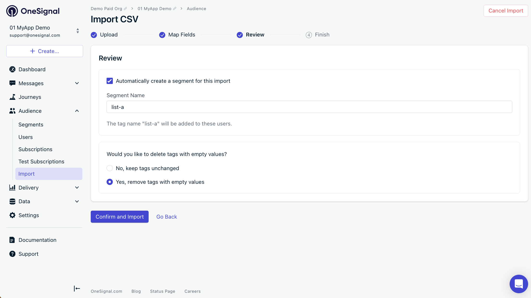 On the Review screen, you have the options to:- Autoamtically create a Segment for this import.