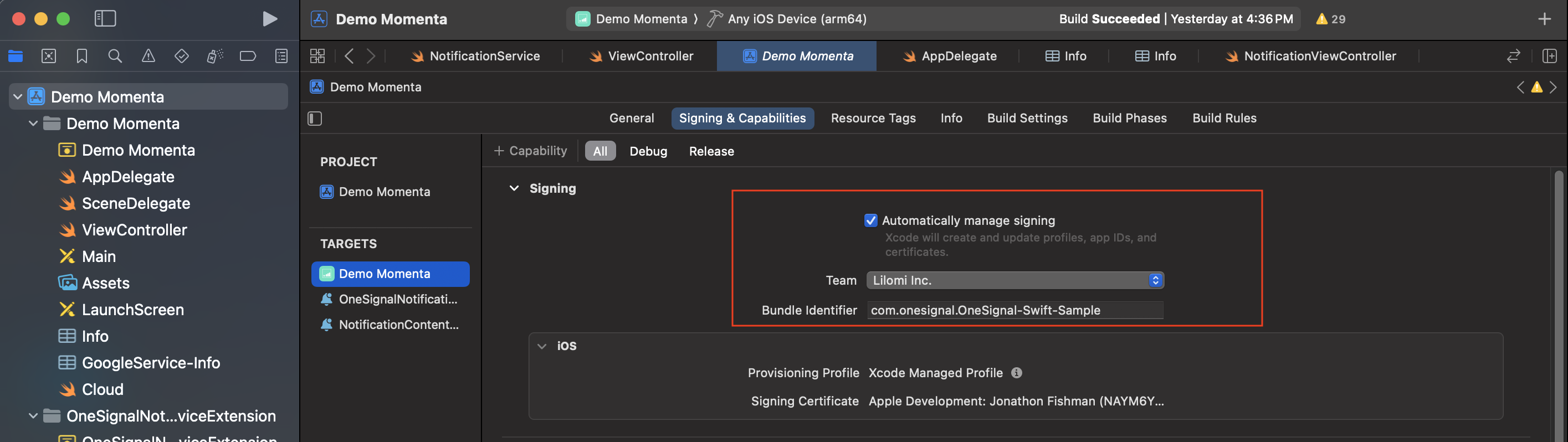 - In Xcode > Main App Target > Signing & Capabilities