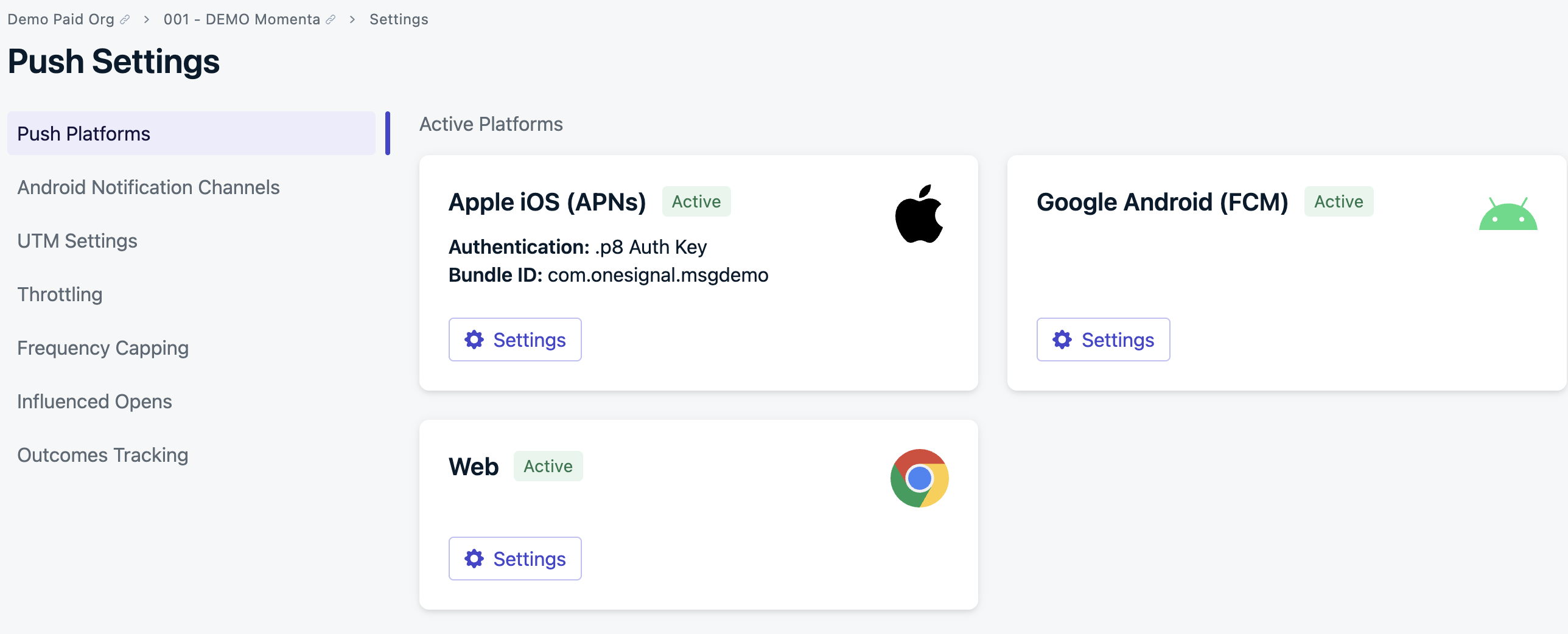 - Navigate to Settings > Push & In-App > Apple iOS (APNs) Settings in your OneSignal dashboard.
