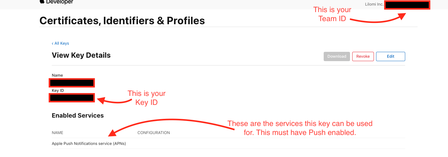 - When viewing your key in Apple Developer, the Apple Push Notifications service (APNs) capability should be listed.