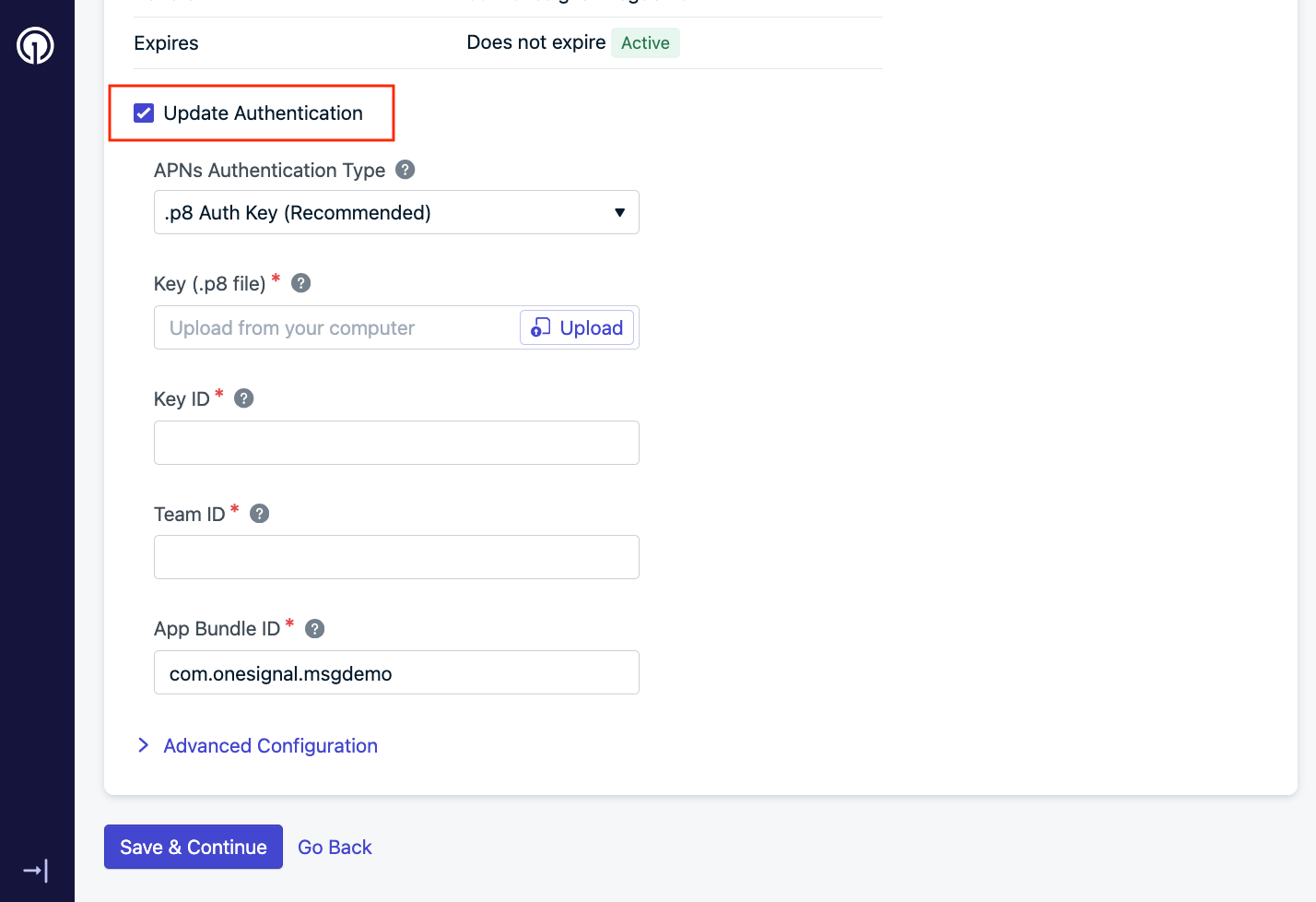 Upload the .p8 key to OneSignal