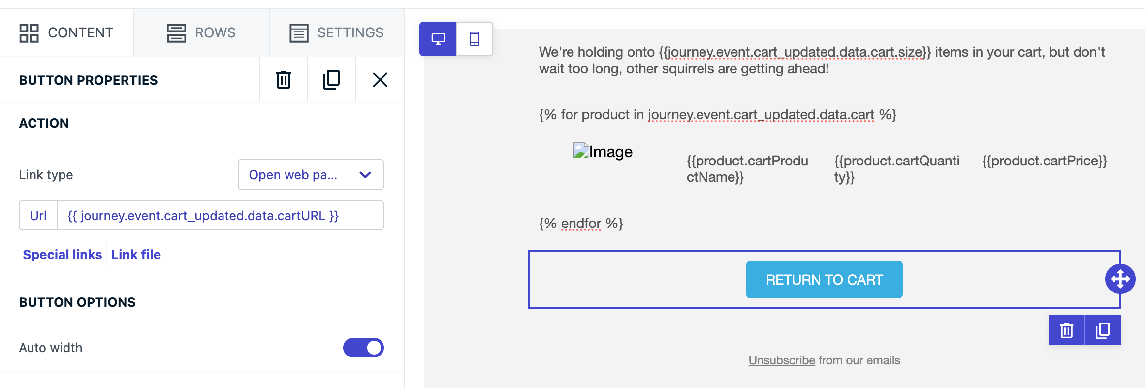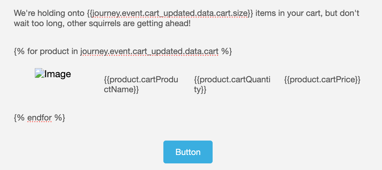 Liquid for-loop를 사용하여custom_data 장바구니 배열을 반복합니다.템플릿 행 2 텍스트 블록 내에 {% for product in message.custom_data.cart %}를 설정하여 for-loop를 시작합니다.4개의 열이 있는 행 3의 첫 번째 열의 HTML 블록에 다음이 있습니다:{{product.cartProductName}}{{product.cartQuantity}}{{product.cartPrice}}