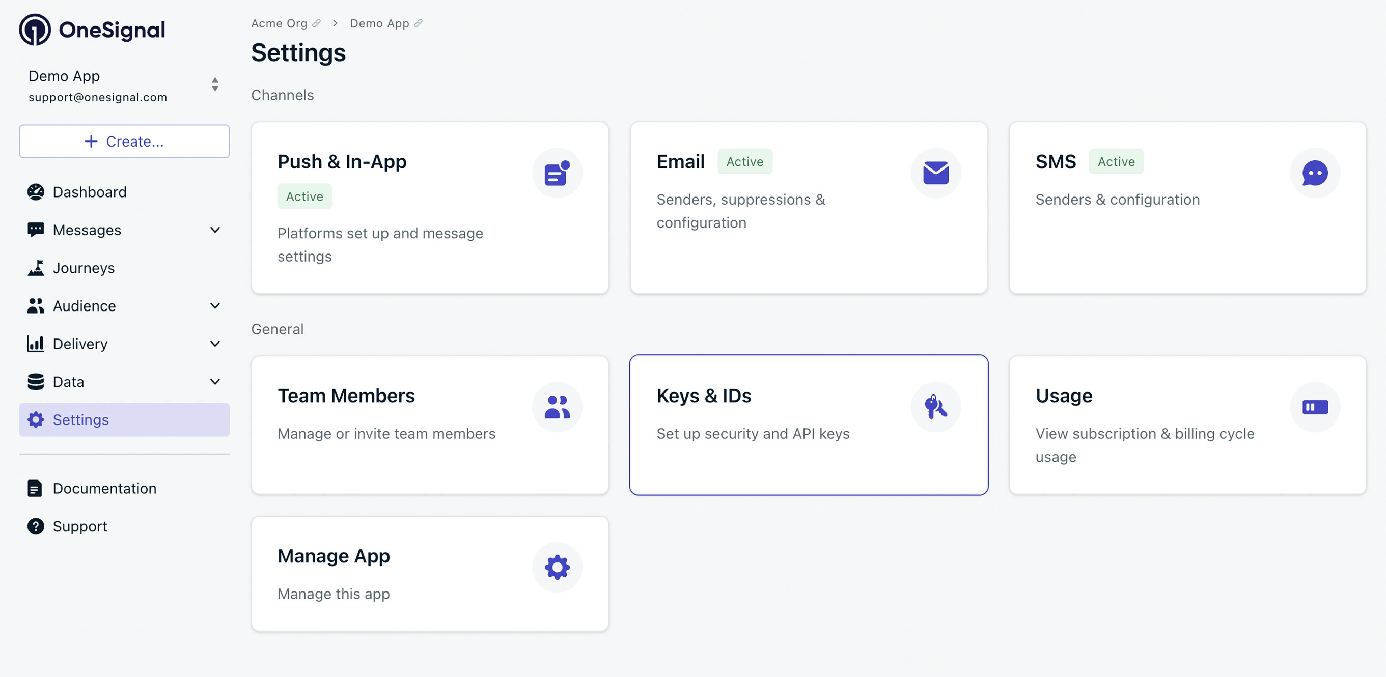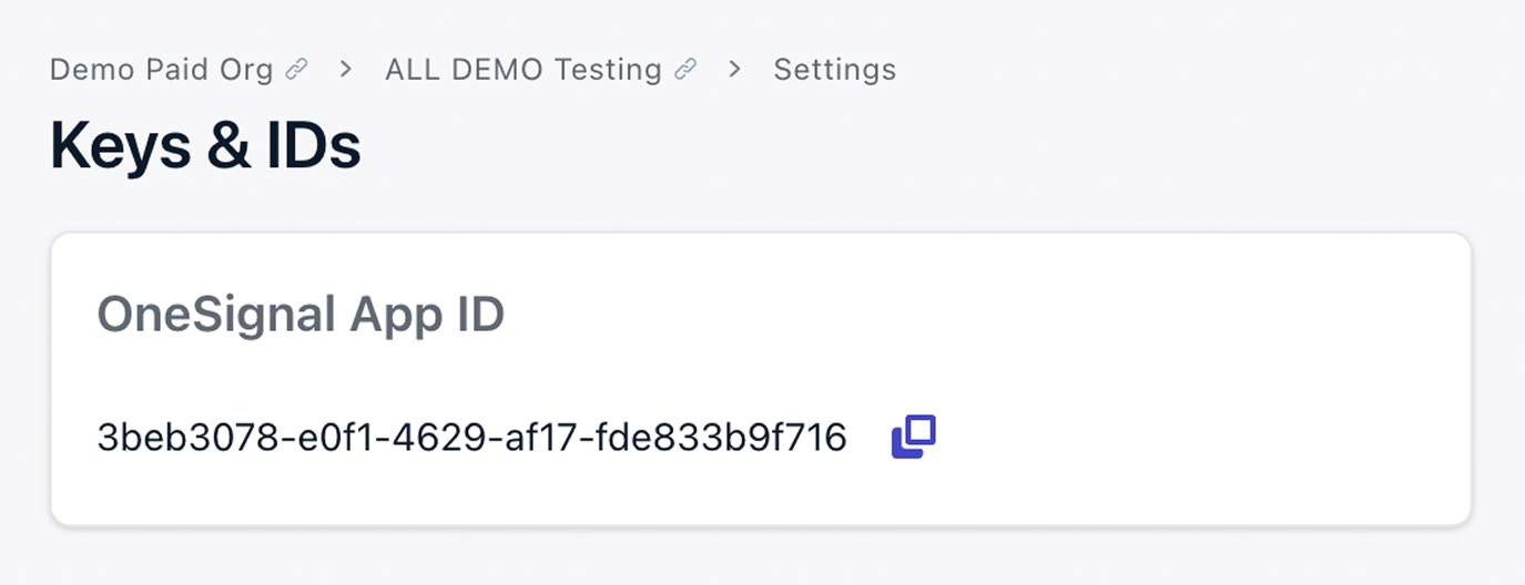 앱 ID는 UUID v4로 형식화된 OneSignal 프로젝트의 고유한 공개 식별자입니다. 비공개 API 키와 구별되며 다음에 필요합니다:- SDK 초기화 – 모바일 SDK 설정, 웹 SDK 설정