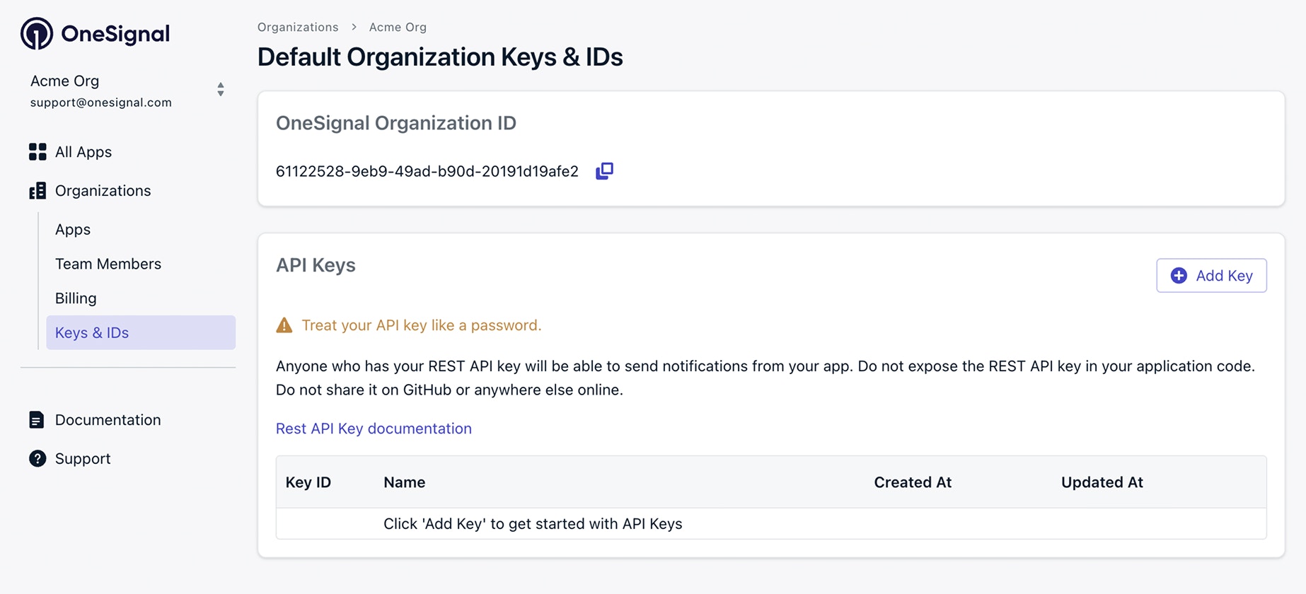 - 조직 API 키 – 조직의 키 및 ID 섹션으로 이동합니다.