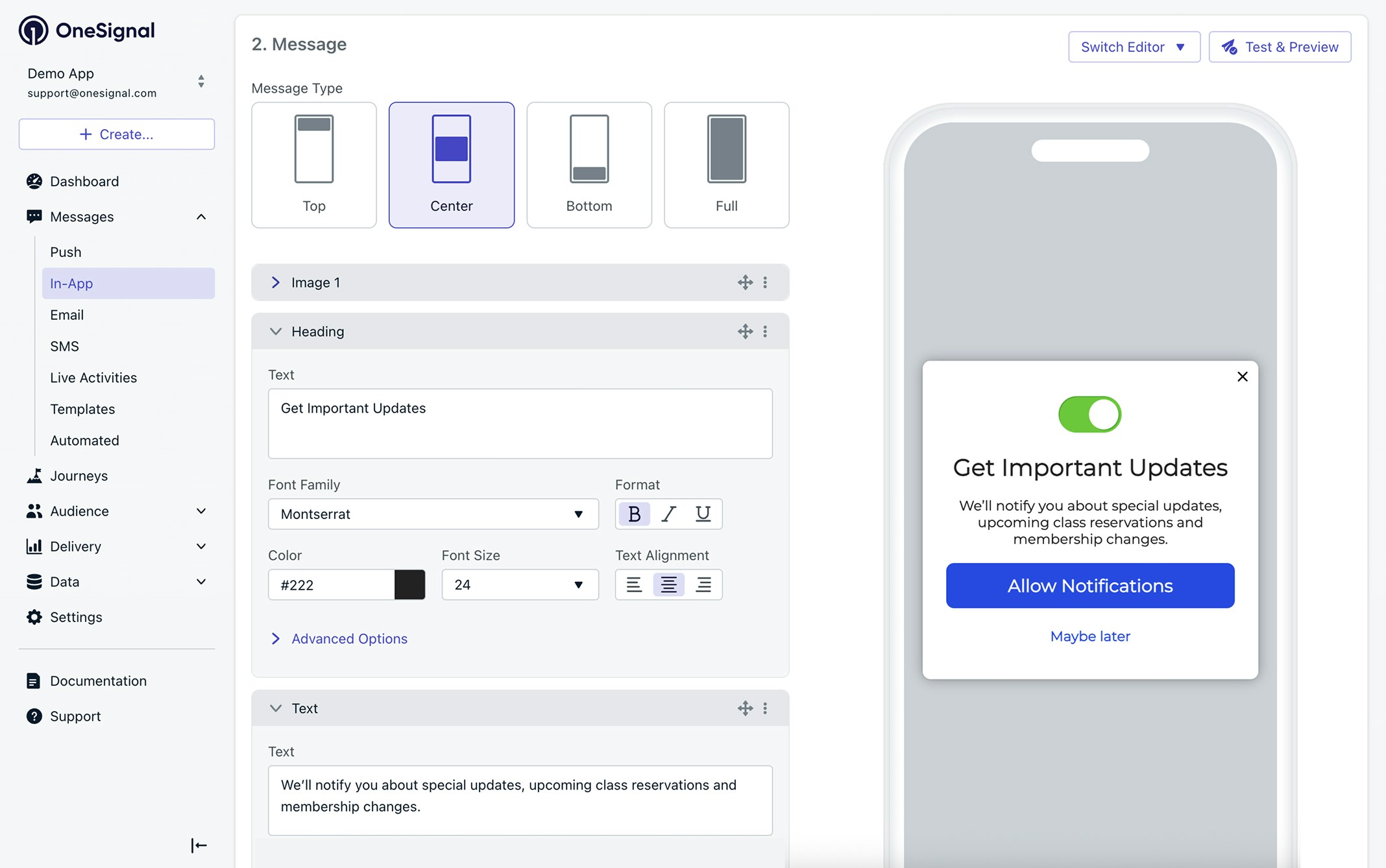 모바일 플랫폼에서는 사용자가 푸시 알림을 받기 위해 구독(일명 “옵트인”)해야 합니다. 여기에는 사용자에게 권한을 요청하는 프롬프트를 표시하는 것이 포함됩니다. Apple의 Human Interface Guidelines에서는 앱이 “보내려는 정보 유형을 설명하고 사람들에게 옵트인 또는 옵트아웃할 수 있는 명확한 방법을 제공하는 알림, 모달 뷰 또는 기타 인터페이스를 만들 것”을 권장합니다. OneSignal의 In-App 메시지를 사용하여 이 경험을 구축할 수 있습니다.