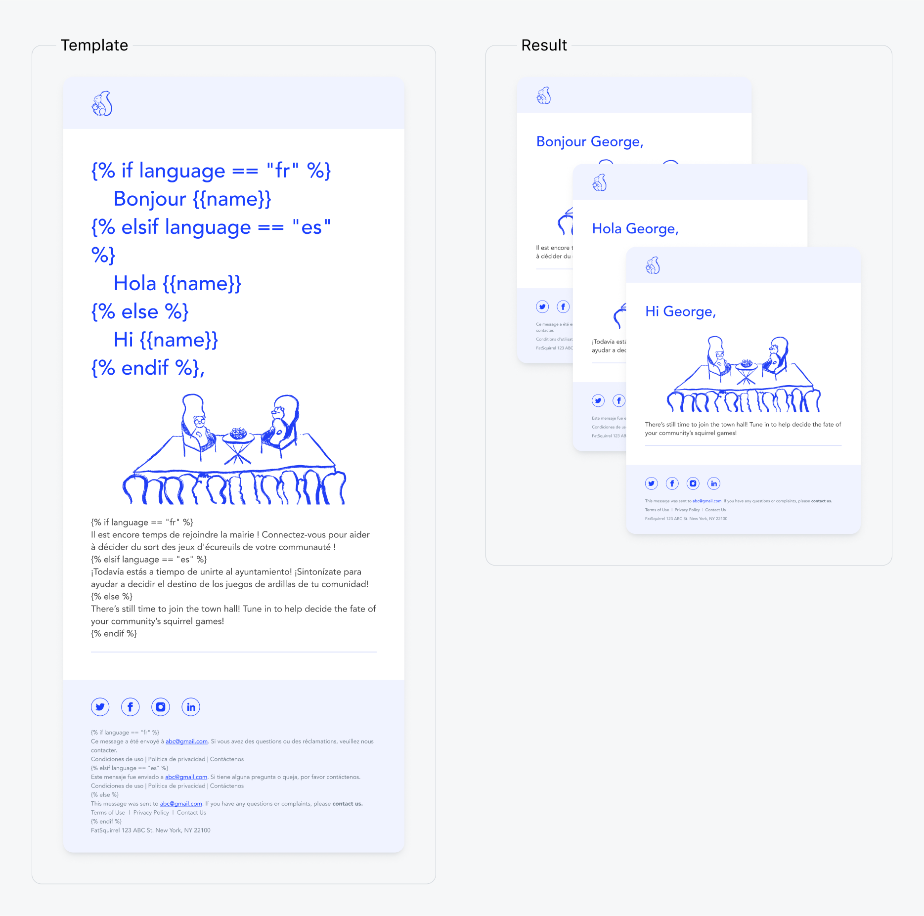 제공된 템플릿을 사용하여 각 언어로 메시지 형식을 지정합니다.