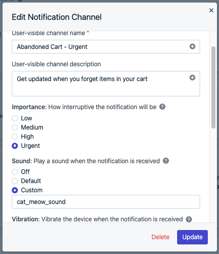 사운드 및/또는 Android Notification Channel을 참조하는 Template을 사용하세요.알림이 사용자 지정 사운드 파일을 재생하지 않는 이유는 무엇인가요?