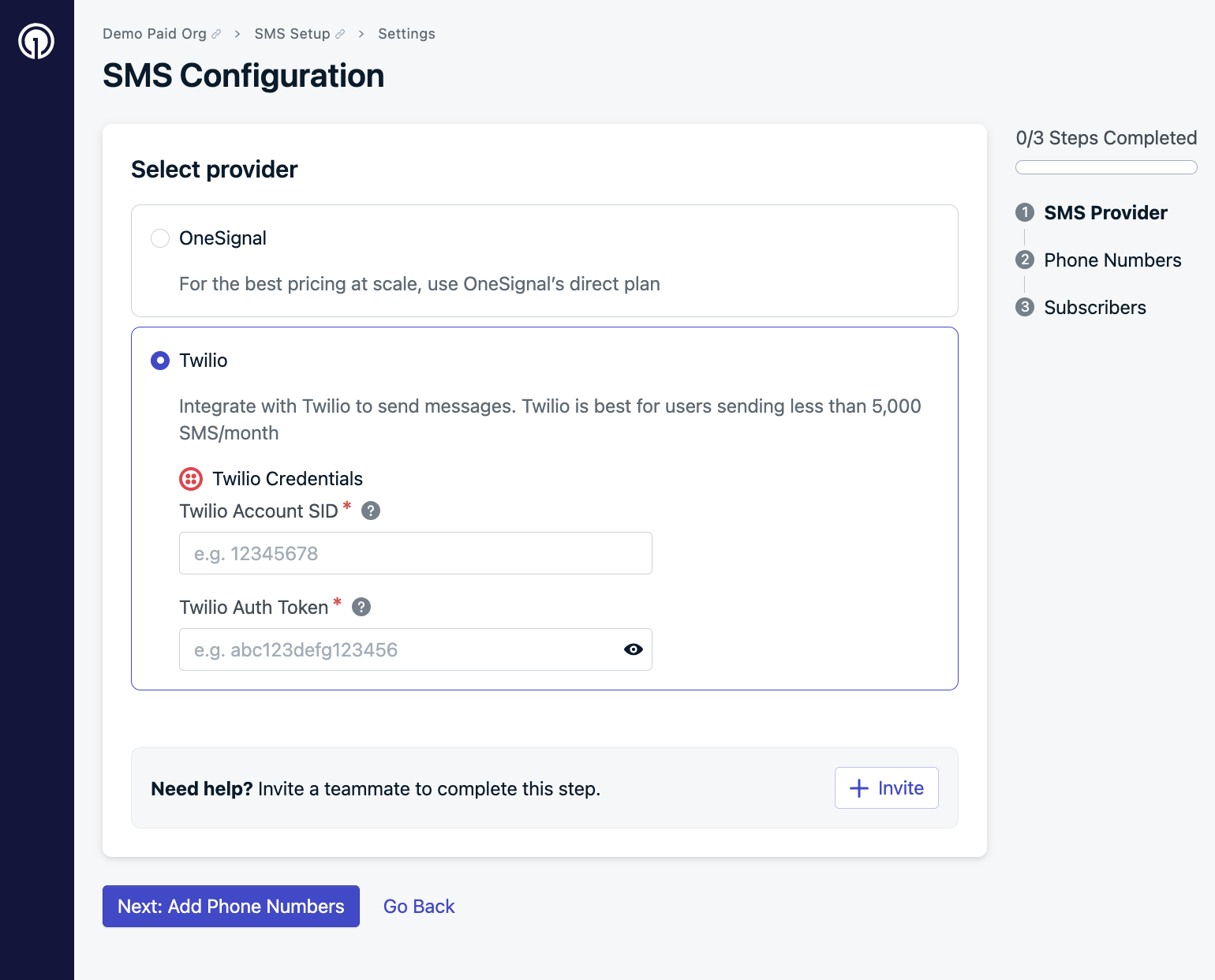 OneSignal 대시보드에서 설정 > SMS > SMS 설정으로 이동하세요.제공업체 선택