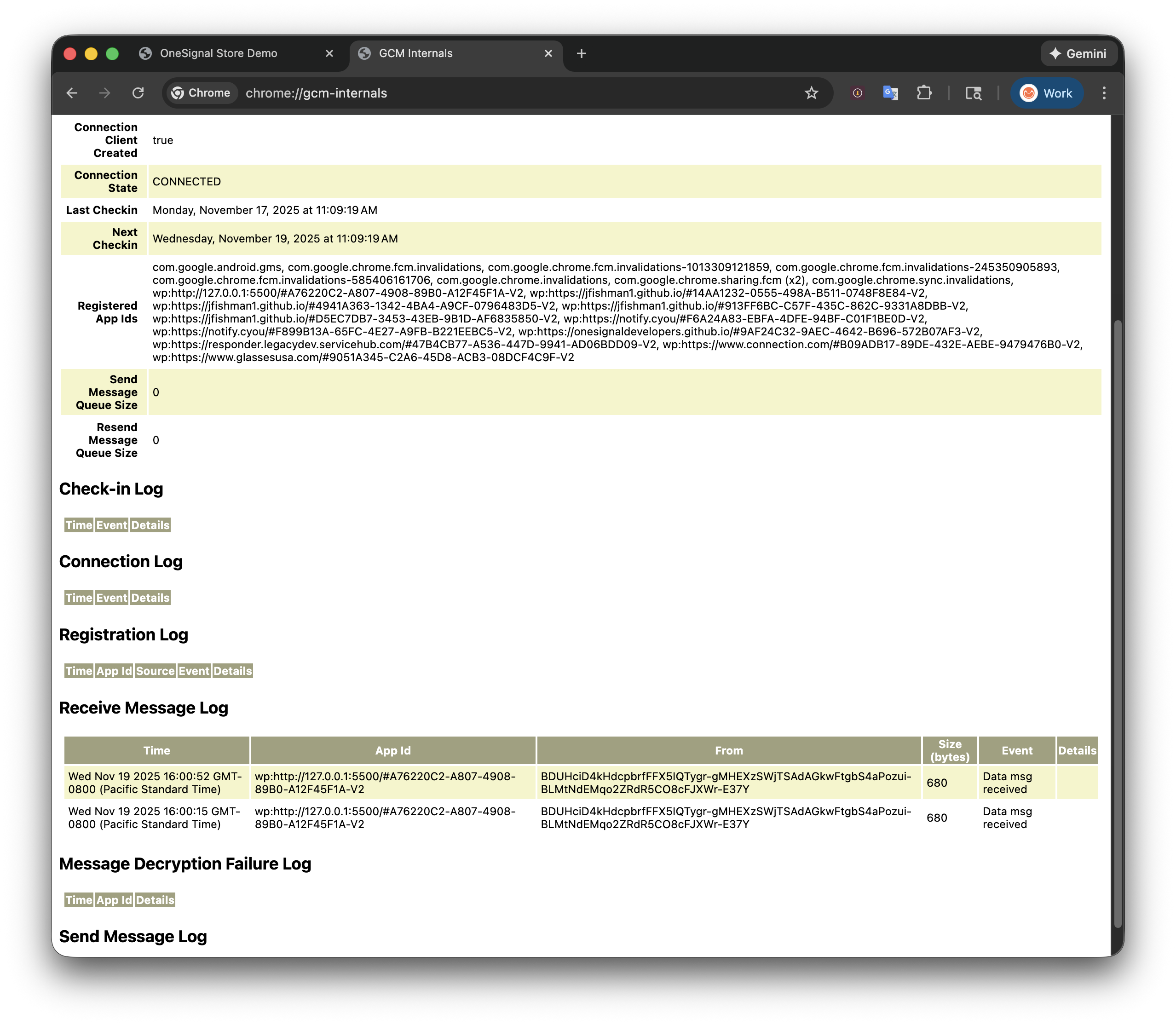 chrome://gcm-internals를 엽니다. - 왼쪽 상단의 “Start Recording” 버튼을 클릭합니다. “Connection State: CONNECTED”가 표시되는지 확인하세요.