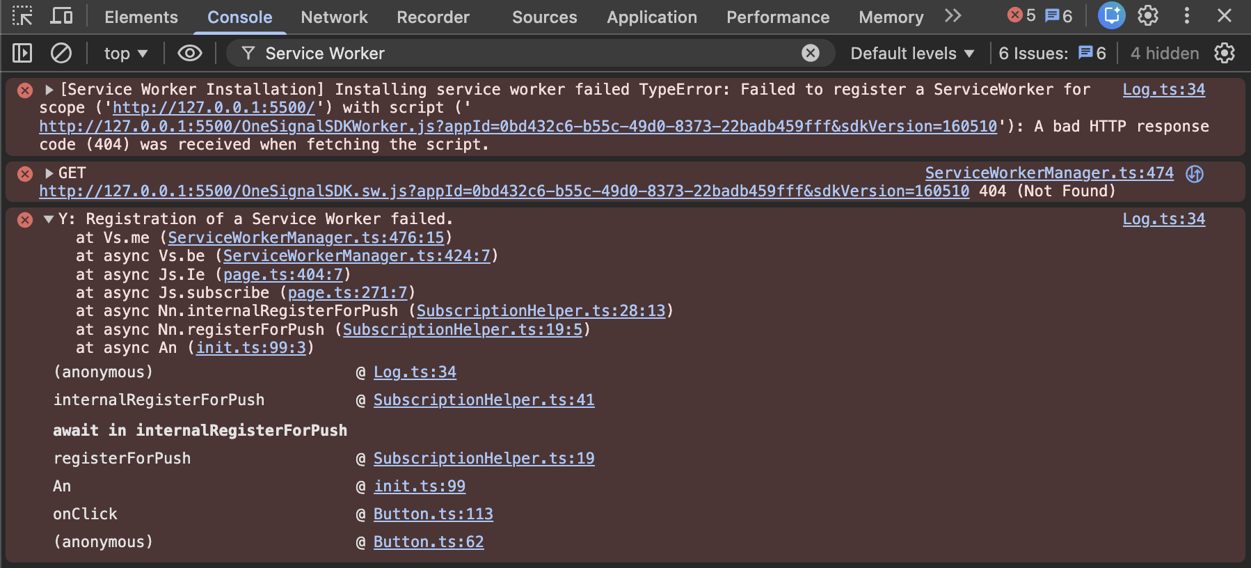 OneSignalSDKWorker.js 서비스 워커 파일을 찾습니다.SDK가 서비스 워커 파일을 찾을 수 있도록 올바른 파일 이름, 위치 및 범위를 구성했는지 확인하세요.2