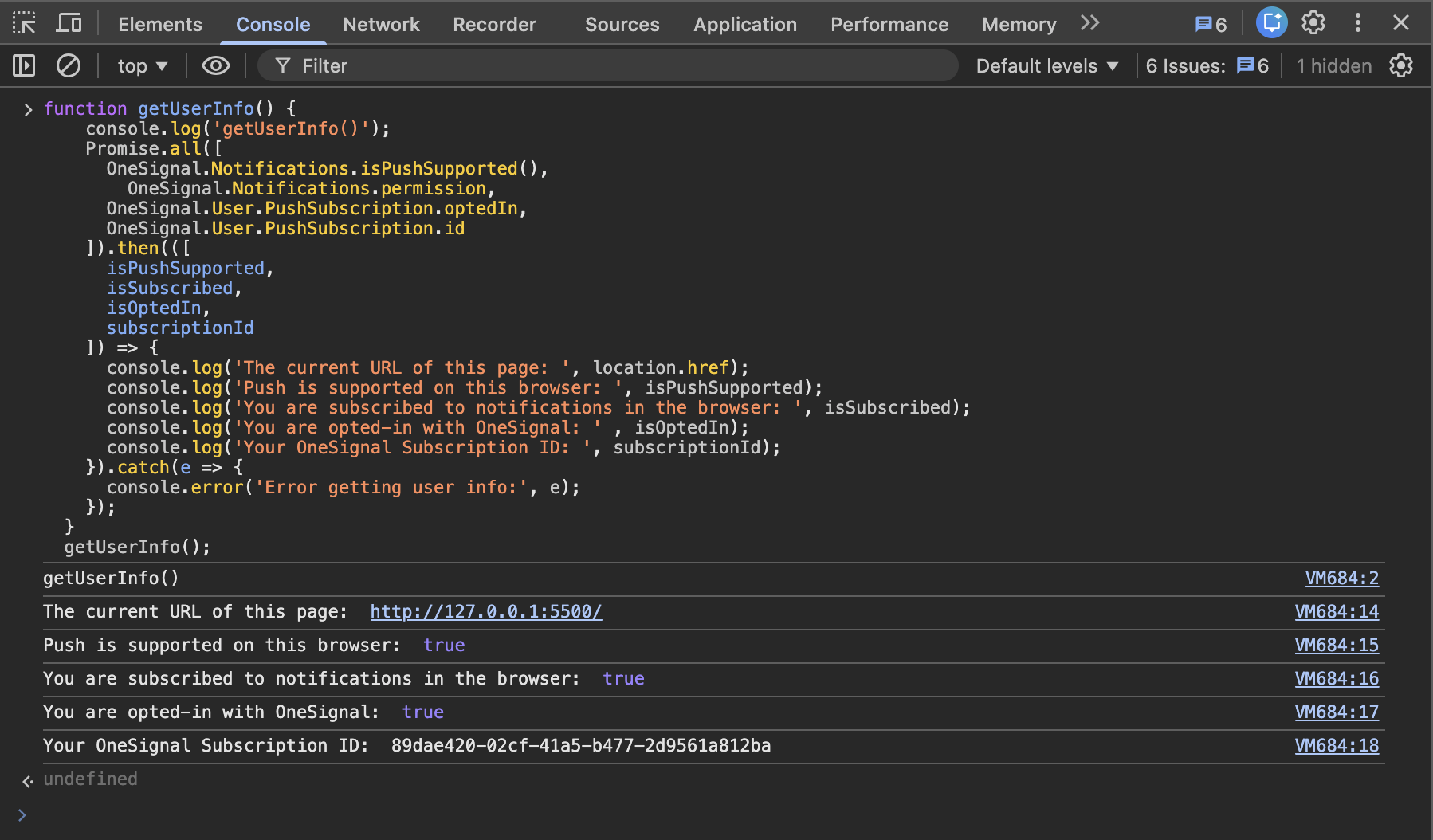 - 콘솔에서 OneSignal SDK 로그가 표시되기 시작합니다.