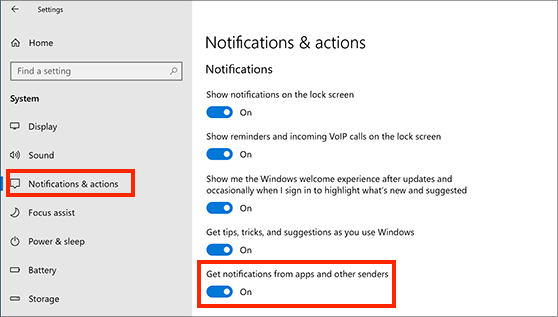 - 시작 > 설정 > 알림 및 작업 > 앱 및 기타 보낸 사람의 알림 받기를 선택합니다