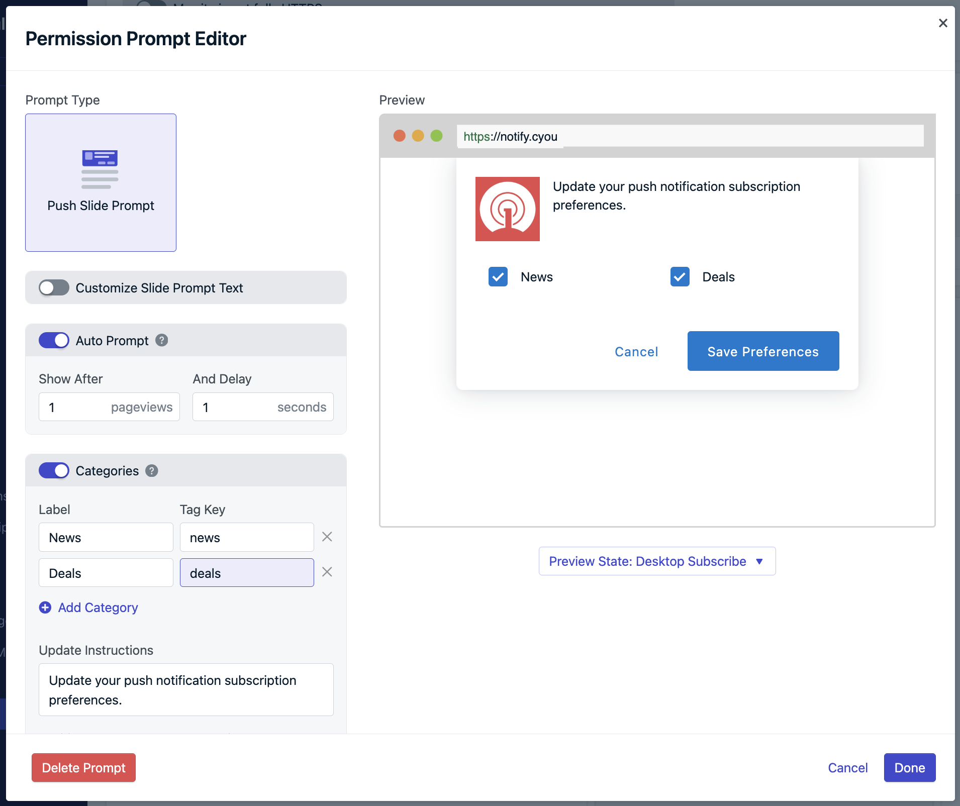 Push, Email 및/또는 SMS에 대한 권한 프롬프트를 설정하세요. Push Slide Prompt가 기본적으로 활성화되어 있지만, 추가 프롬프트를 사용자 지정하거나 추가할 수 있습니다.- 기본 프롬프트 설정