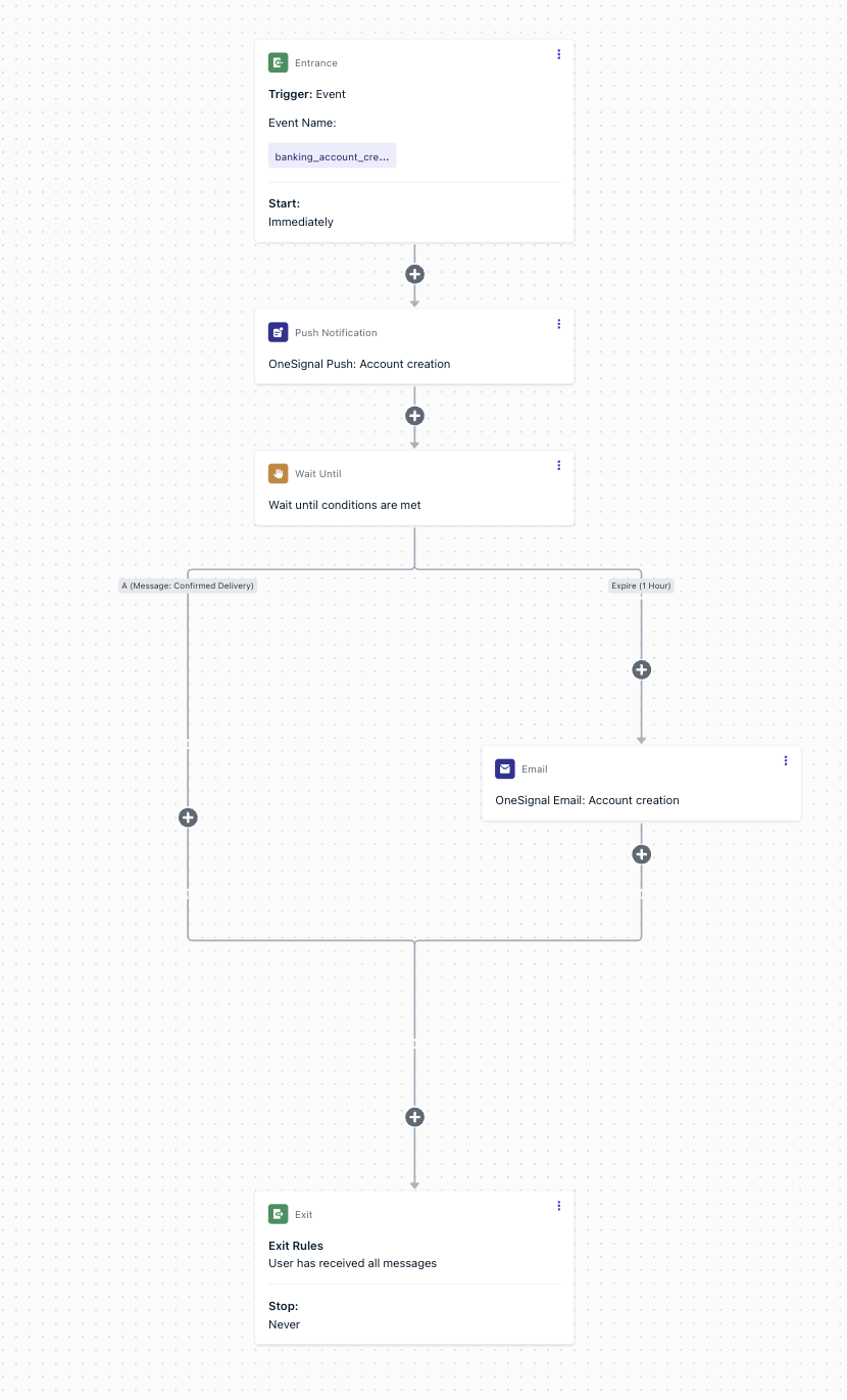 Kod yazmadan yedek mantığı görsel olarak otomatikleştirmek için OneSignal Journeys’i kullanın.- Sürükle ve bırak arayüzü